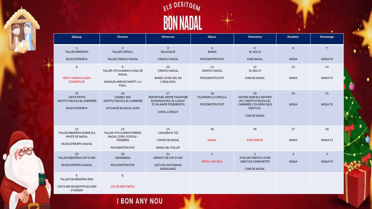 Nadal, amb els clàssics pastorets, la bonica Missa del Pollet, els tallers amb referències a Nadal, el seu origen, l’Advent, la visita dels Reis Mags, la decoració amb el pessebre a la capella, concerts nadalencs, recitals de poemes.