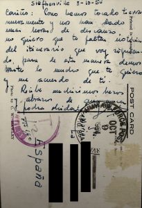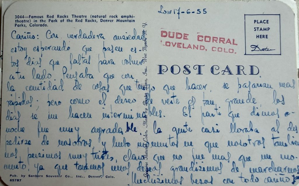 “Cariño: Con verdadera ansiedad estoy esperando que pasen estos días que faltan para volver a tu lado. Pensaba que con la cantidad de cosas que tengo que hacer, se pasarían  más rápidos; pero como el deseo de verte es tan grande, los días se me hacen  interminables. El parto que dimos anoche fue muy agradable, la gente casi lloraba al despedirse de nosotros, y hubo momentos en que nosotros también nos pusimos muy tristes,     claro que no fue más que un momento, ya que tenemos unas ideas grandísimas de marcharnos. Muchísimos besos con todo cariño de …”