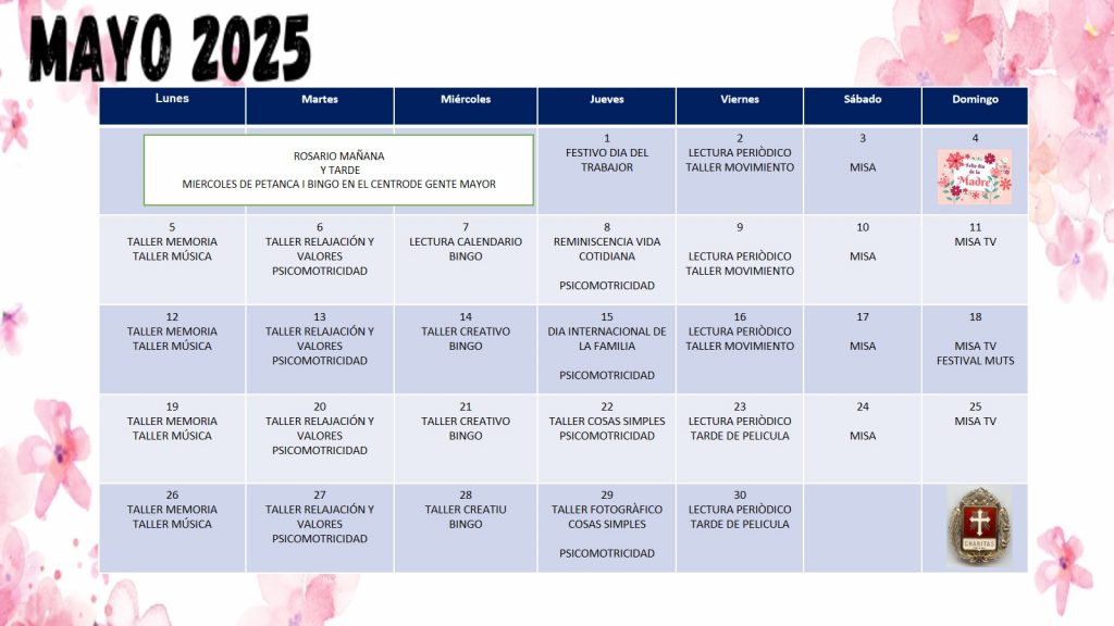 También se realizan muchas actividades de carácter religioso voluntarias y buscan ofrecer a nuestros usuarios la posibilidad de acercarse, si así lo desean, a los valores cristianos.